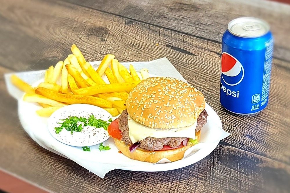 Grilled beef patty topped with lettuce, onions, tomatoes, Swiss cheese and mayonnaise. Served with choice of side and drink.