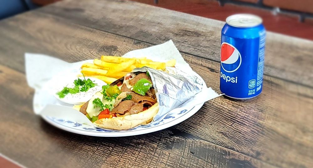 Grilled steak gyro meat mixed with grilled chicken topped with lettuce, onions, tomatoes, Swiss cheese and mayonnaise. Served with choice of side and drink.