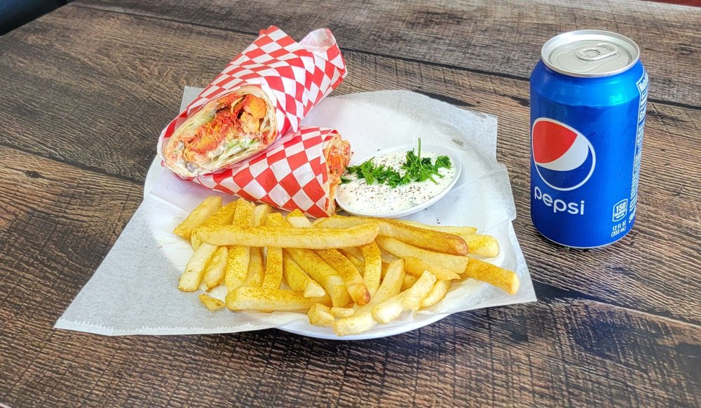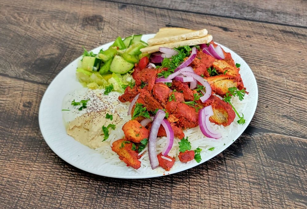 Smashed falafel grilled with onions, tomatoes, bell peppers and mushrooms. Served with choice of side and drink.