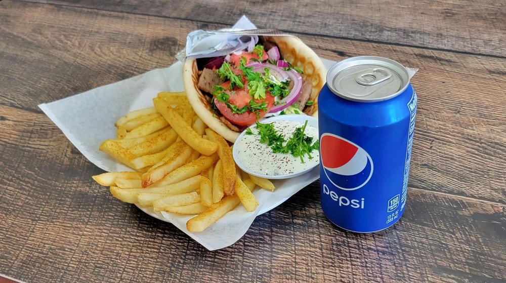Thin marinated slices of lamb, steak and chicken. Served with choice of side and drink.