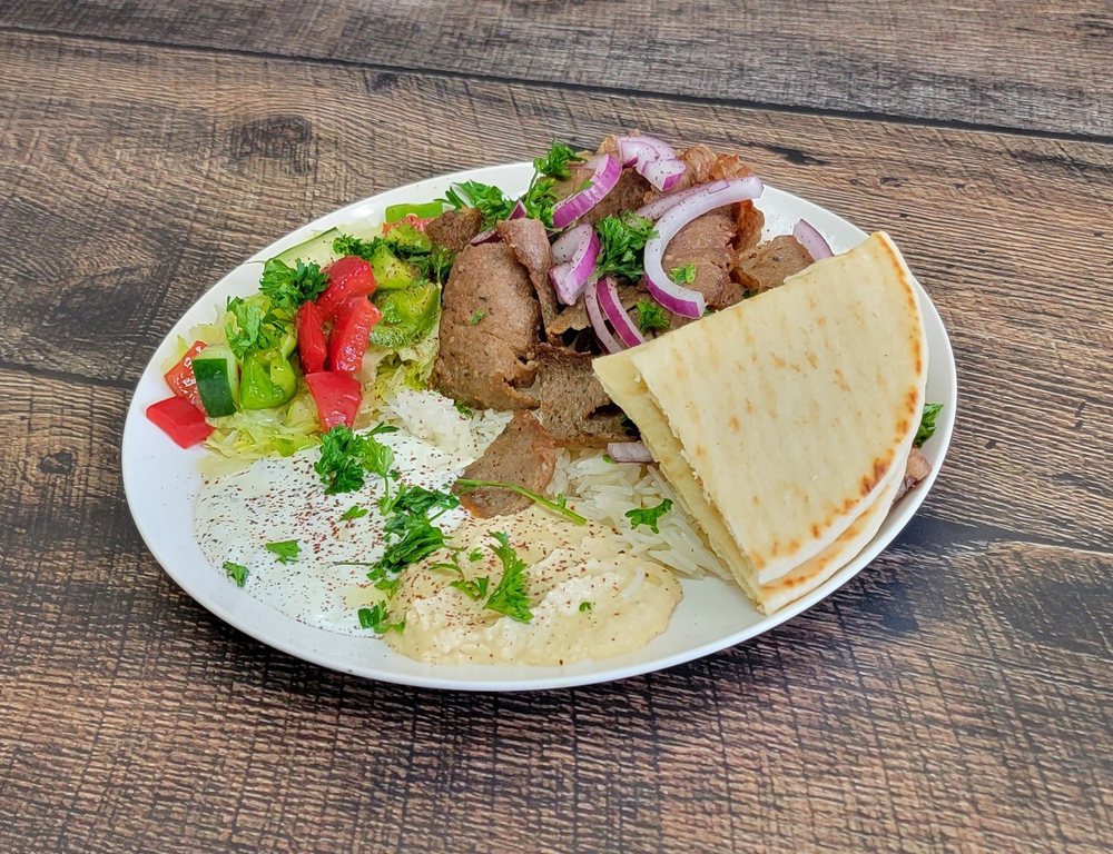 Thin marinated slices of lamb or steak with chicken. Served with choice of side and drink.